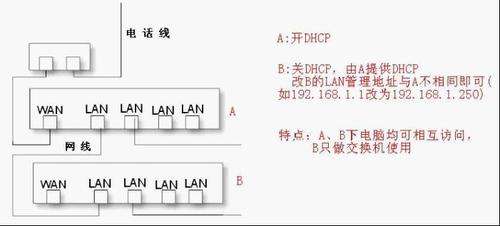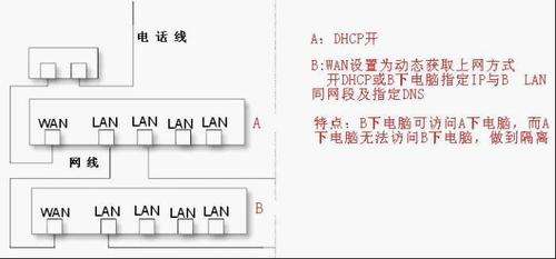 1从A室进来的网线接B路由器的WAN口,LAN口接电脑