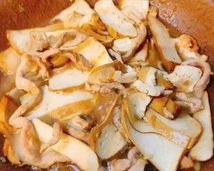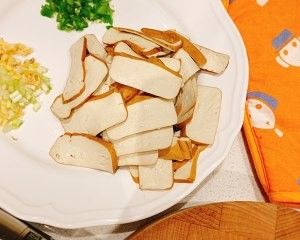 加水,最好是热水。水不能太多,不要没过豆干。最小火咕噜一会儿,豆干会吸满汁水。