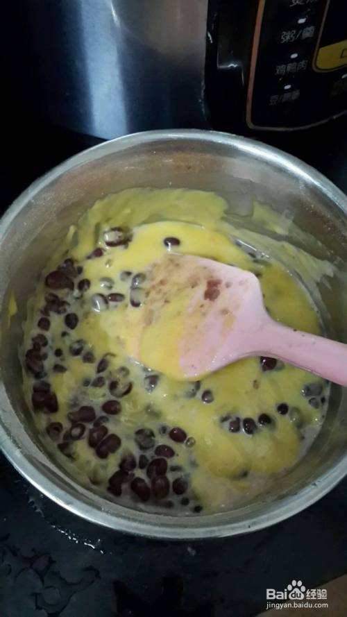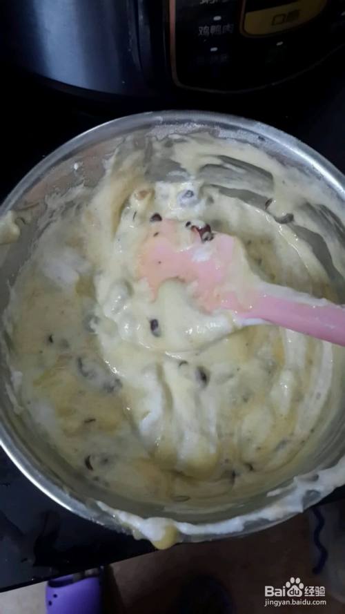 凉后红豆加入蛋黄糊里切拌匀,切拌匀后蛋黄糊放一边待用
