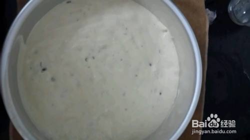 将混合好的蛋糕液倒入铺好油纸的模具里然后震几下把气泡震出