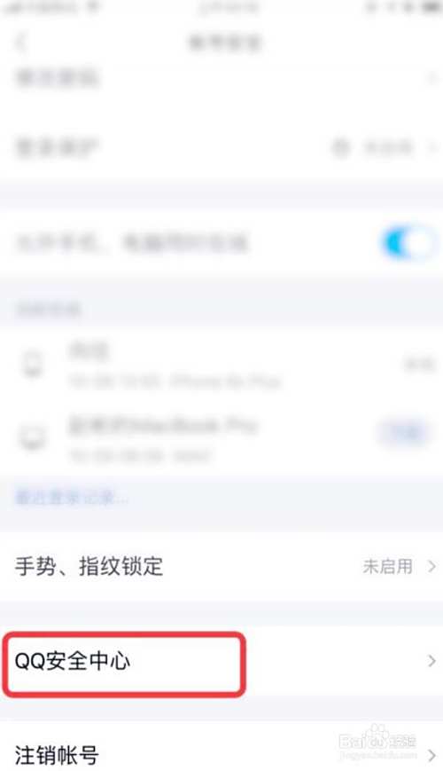 在【账号安全】界面,选择并点击【QQ安全中心】选项。