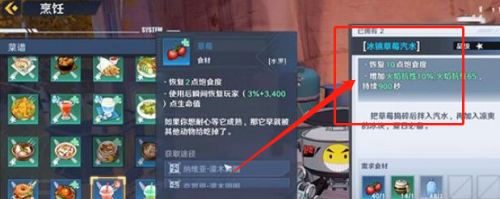 冰镇草莓汽水,食用后增加火焰抗性10%,火焰抗性65,持续900秒。