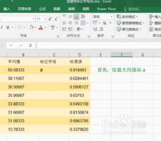 先将平均数由大到小排列(从上到下排列),在最大平均数后标记字母 a 。