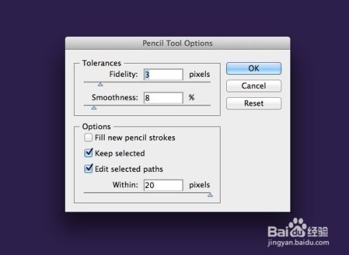 双击铅笔工具来编辑其设置。改变富达和平稳周围的3px和8%,但调整这些设置,以满足您自己的喜好,如果你的铅笔线条不被绘制为准确或那样顺利,你会喜欢的。两个重要选项也选择保留选择和编辑选择的路径