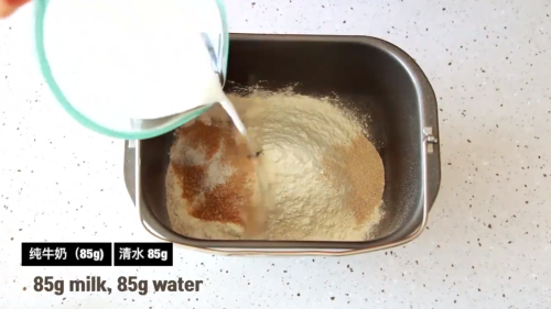 2碗中放入全麦面粉、奶粉、红糖、食盐、干酵母粉、清水、牛奶。