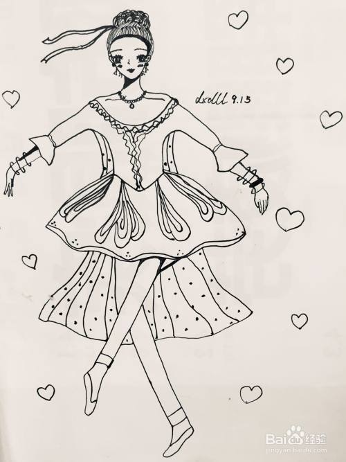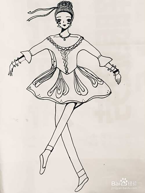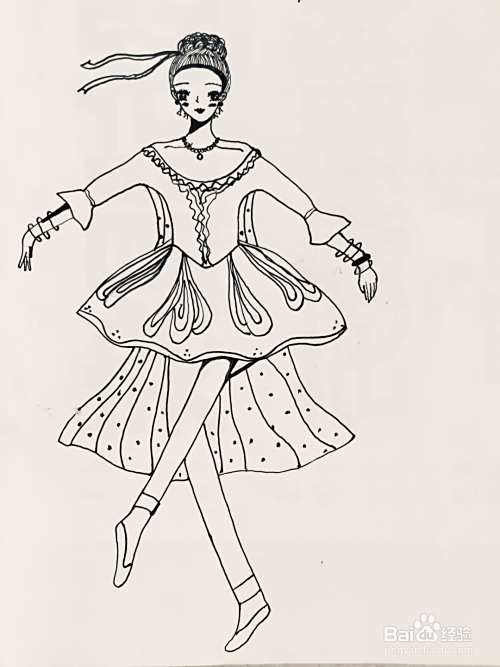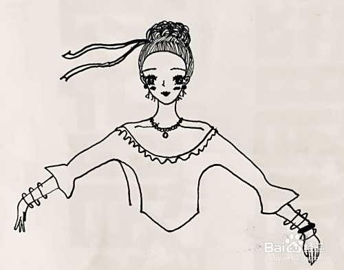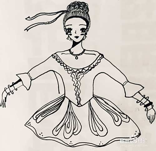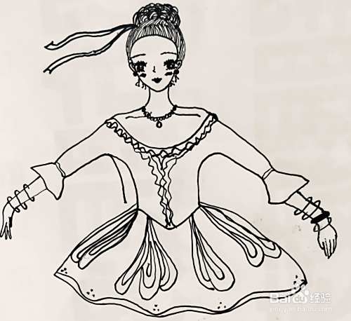 用笔画出人物的舞蹈服,我们在其袖口处画出花边,在其领口画出装饰的花型褶皱。