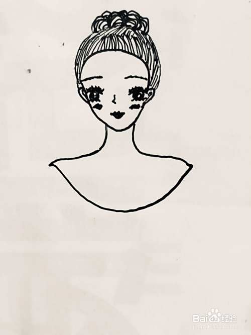 我们在其面部画出五官,在其下巴位置线条下沿,画出脖颈和双肩。我们画出脖颈上的项链和肩膀的锁骨线条。