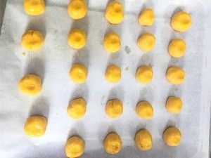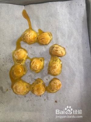 咸蛋黄放入烤盘,喷洒些高度白酒,然后放入烤箱175度,烤20分钟,取出。