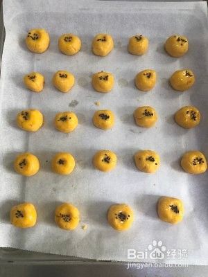 分成等量的小球,放入烤盘,用手指轻轻按压一下,刷上蛋液,再撒上黑芝麻,也可以不撒