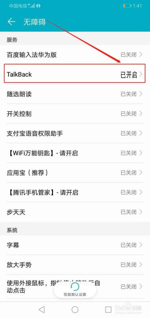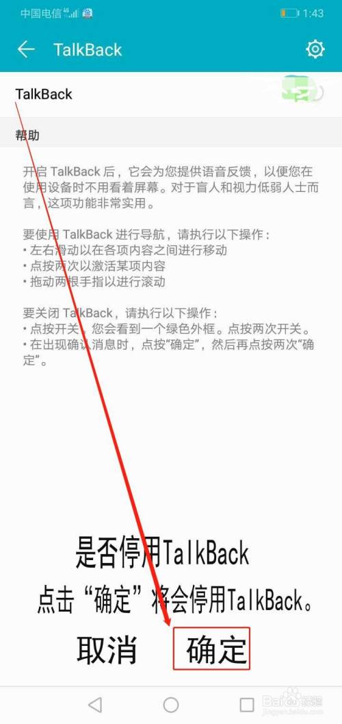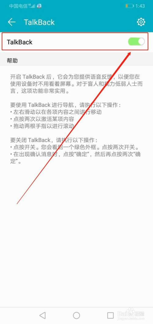 4、此时 TalkBack 为已开启状态,双击打开。如图所示: