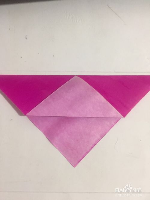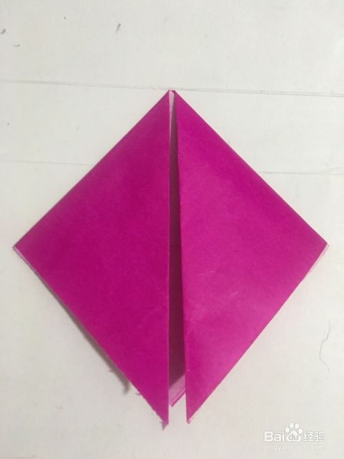 第一步 把一张12厘米X12厘米的正方形二红色彩纸 从上向下对角折叠 然后再从下角向上对折 最后把左右两角折叠至中线向下