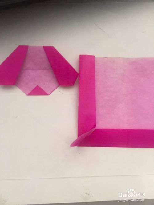 第四步 折叠完之后 再折叠上小狗的身子 把另一张彩纸平放把左边和底边都向里折叠2厘米左右角上多余的用来作小狗的尾巴