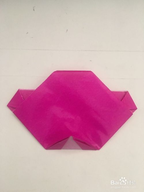第三步 折叠完之后 上下翻过来 下角向上折叠一个三角 两只耳朵尖向里折叠一个三角 并且塞进双边