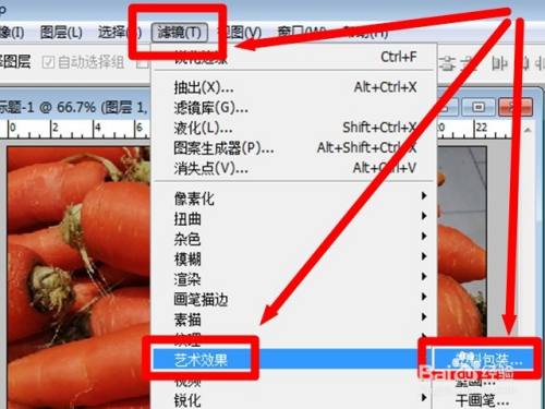 点击“滤镜”图标打开对话框,选择“艺术效果”;右滑鼠标,选择“塑料包装”。