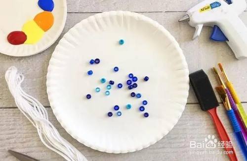 准备好纸盘、丙烯颜料、热胶枪、彩珠、毛线等。