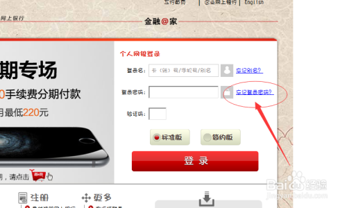 此时,就是问题的重点了,在工商银行的个人网银界面上有如图所示的"忘记登录密码?",那么,我们只需点击一下图中标记的选项,进入下一界面。