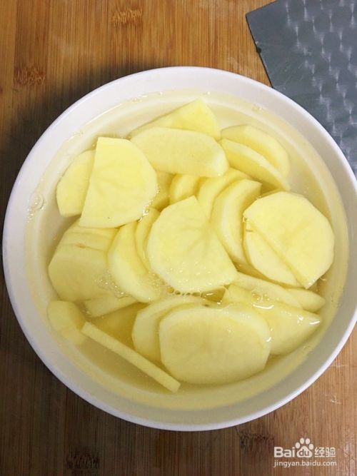 把土豆片放入水中冲洗,洗去表面的淀粉,然后放入碗中,加入适量水,水面要超过土豆片。