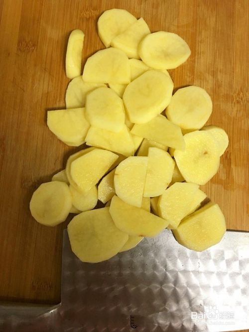 土豆清洗干净后,刨去土豆片,然后切成厚度约为2-3毫米的薄片。
