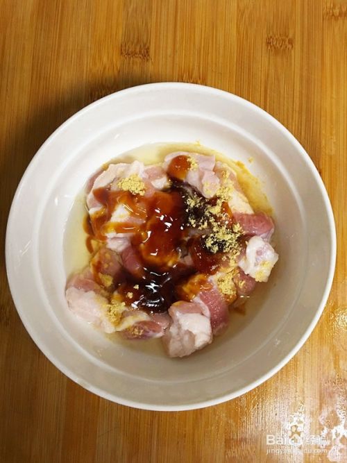 把五花肉片放入碗中,依次加入10g料酒、生抽、耗油和5g生姜粉,用手抓匀,静置20分钟左右。
