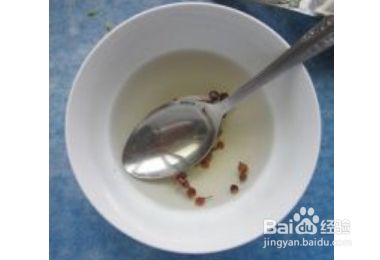 随后找一个碗,把花椒放在一个碗里边,再倒入开水泡15分钟,让水有一种花椒味。