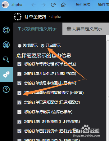 在订单全链路中点“基础设置”,点“开启显示” ,选择自己显示想让买家看到的订单状态,点击“点击保存”