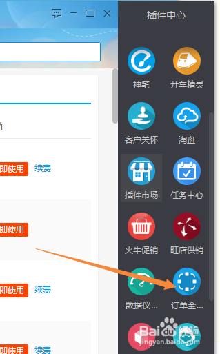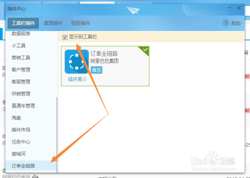 在千牛插件市场点击设置,打开千牛 插件中心,在千牛插件中心点最下面的“订单全链路” ,选中 “显示到工具栏”,关闭插件中心