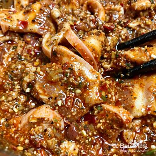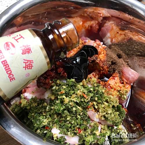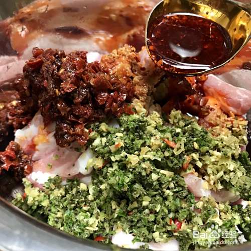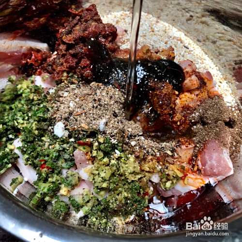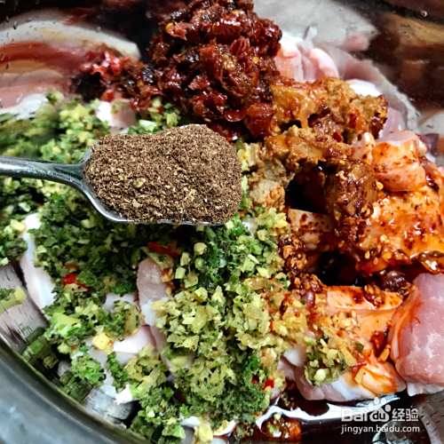 调味 把剁碎的青花椒,小葱碎,泡姜泡辣椒碎放进五花肉里,放豆瓣酱两汤匙,红油辣椒两大勺,豆腐乳一大块,盐巴适量。