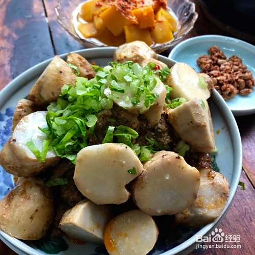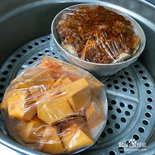 把芋头放在碗下面,把调好味的五花肉放在芋头上面。蒙上保鲜膜,再戳几个洞,上锅蒸一个半小时左右。今天蒸一个小时,芋头还有点硬,肉也不够化渣! 如果用高压锅,就不能用保鲜膜,保鲜膜会蒸化了,需要扣一个盘子。 高压锅还没有蒸过,估计也得蒸四十分钟。