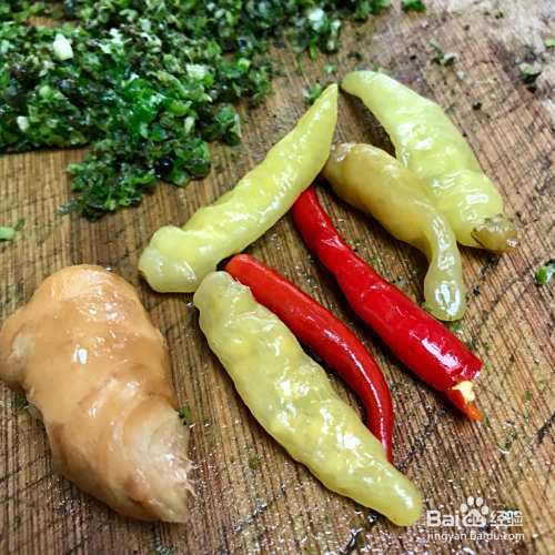 泡小米辣6根,泡姜一块切碎末。 我发现粉蒸肉放少量泡姜泡辣椒会特别提味 ,不可多了,少了味道不足够,多了会很辣,味型会改变了。