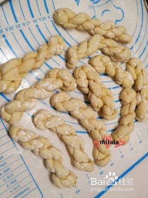 扭好后撒上干粉,让麻花二次发酵几十分钟即可