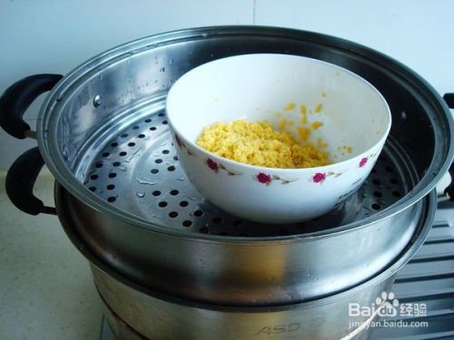 把蒸锅加水,加小米和南瓜一起下锅蒸熟取出,(大约上汽之后蒸15分钟左右)