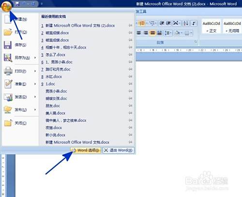 在打开的文档页面中,点击【OFFICE】按钮,在弹出的菜单中点击【WORD选项】按钮。