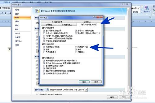 点击【键入时自动套用格式】选项卡,然后将【自动编号列表】选项前的对钩予以取消,设置后点击【确定】按钮。