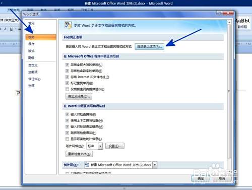 左边选择【校对】选项;在右边的选项中点击蓝色箭头指向的【自动更正选项】按钮。