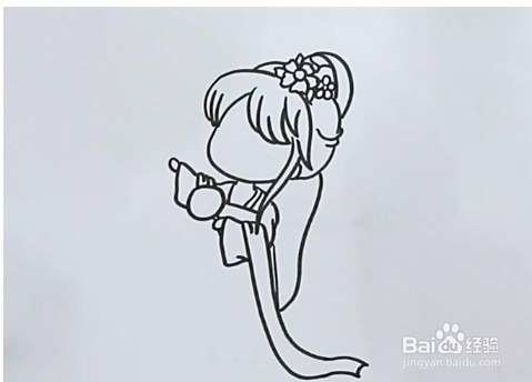 接着往下画出人物上半身,双手微向上抬起,一手拿着圆扇,飘带搭在腕上。