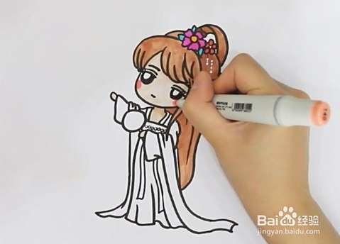 首先,画出头发和面部线条的轮廓,补充完整人物的身体和衣服,微微抬起你的手,一只手拿着一把圆扇子,然后画出人物的面部表情,给人物涂上肤色,给他们的头发涂上棕色和腮红,最后给衣服涂上蓝色和粉色,这样一个美丽的古色古香的女人就完成了。