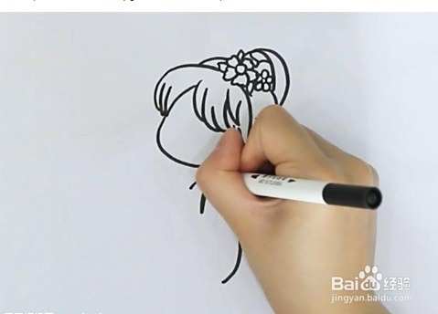 首先要画出人物的头发轮廓,刘海坠在额前,画出头顶上的发饰之后,再画上脸部线条之后。