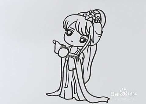 在面部画出人物的五官表情之后,再补充画出人物的下半身,并用线条画出衣裙的褶皱感。