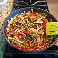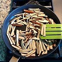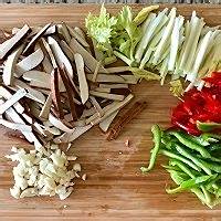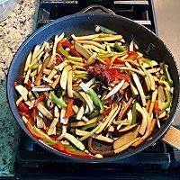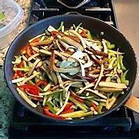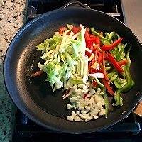 热锅热油,将大蒜青红椒丝芹菜丝一起倒入翻炒。因为是大火热油,如果老规矩先下大蒜的话很容易到后来就糊了,尤其是用平底锅的话。加入1/2茶匙盐,鸡粉,生抽,炒匀。