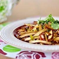 首先大火爆炒香干丝,加1/2茶匙盐调味。炒好后盛出来备用。