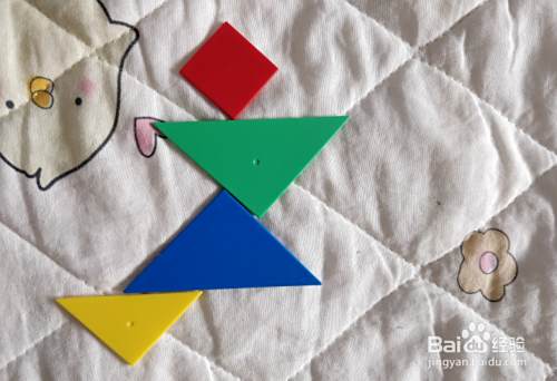 在蓝色三角形的左下,放上黄色三角形挨着,如图。