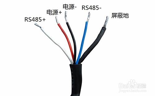 首先,如图可以看到紫外线强度计RS485接口的5根线,白色线是RS485+,蓝色线是RS485-,红色线是电源+,黑色线是电源-,有热缩套管的线是屏蔽线。