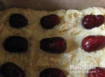 在锅里放入蒸模具(我用的方形盆)中铺上屉布,将发酵好的面倒入,上面放上洗干净的金丝枣盖上锅盖进行第二次发酵约30-50分钟,