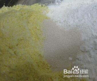 将玉米粉、面粉、酵母、糖放在盆里,用筷子搅拌均匀。