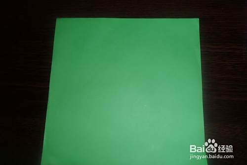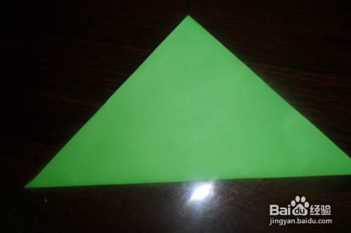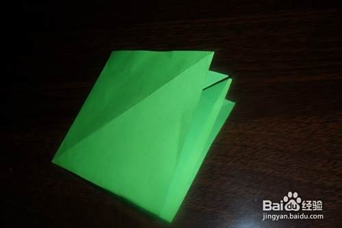 将绿色正方形纸对角折叠。