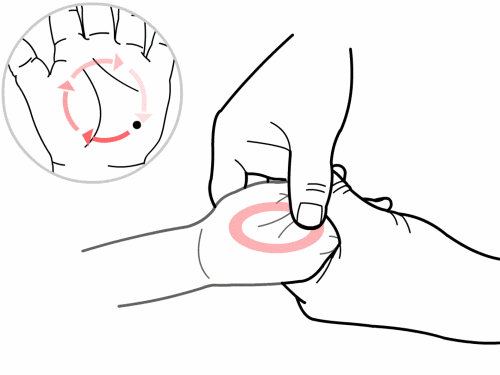位置:手掌面,以掌心(劳宫穴)为圆心,以圆心至中指根横纹,内2/3和外1/3交界点为半径,画一圆,八卦穴即在此圆上。