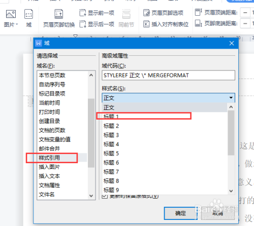 在适当位置点击域,弹出对话框。选择样式引用,标题1.