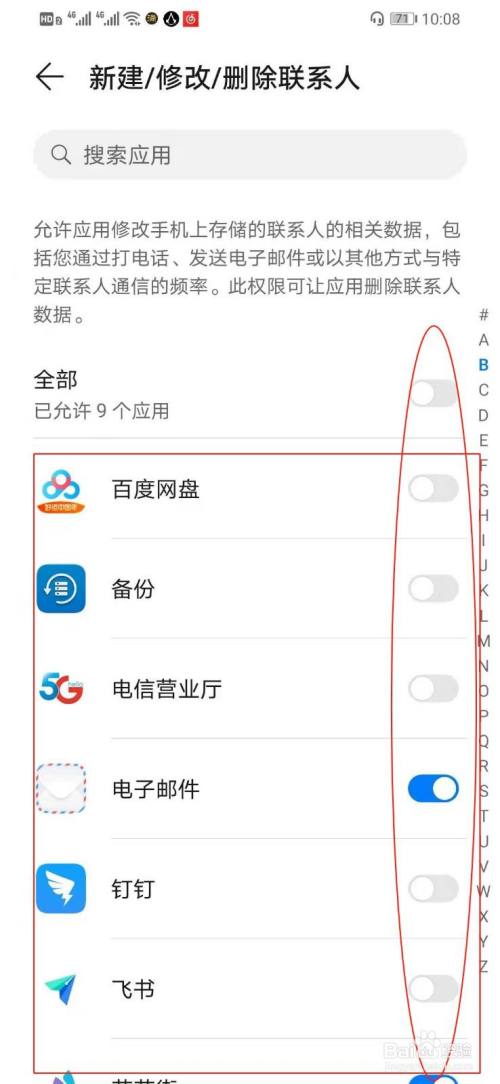 最后点开”新建/修改/删除联系人“,找到需要禁止的应用,将其后边的开关条关闭就可以了。