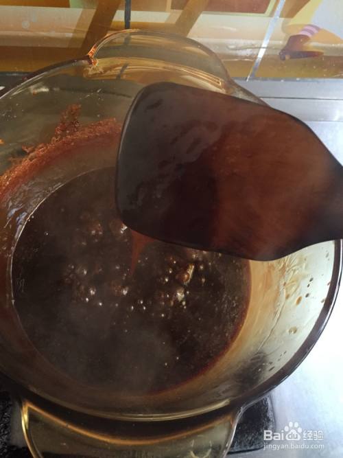 第四步:待阿胶熬到粘稠状,可以挂旗,如图所示,(挂旗就是用勺子舀起来有个小旗子样子)