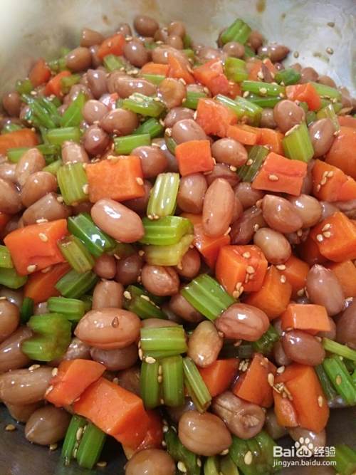 把胡萝卜和芹菜稍微挤一下水份,把三样放在盆里!加入调料2 搅拌均匀,洒上熟芝麻即可!